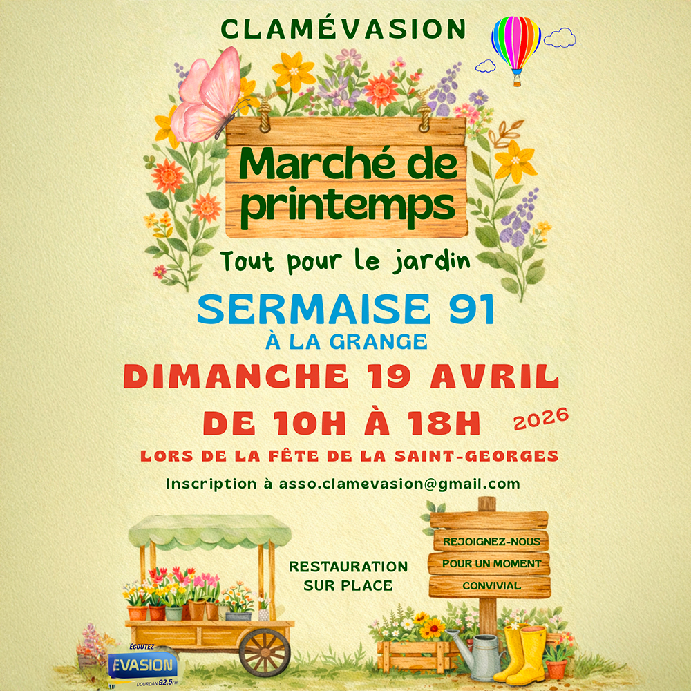 L’association Clamévasion vous invite à son Marché de Printemps à Sermaise. Organisé dans le cadre de la fête de la Saint-Georges, cet événement rassemble tout le nécessaire pour vos extérieurs dans le cadre authentique de la Grange.
