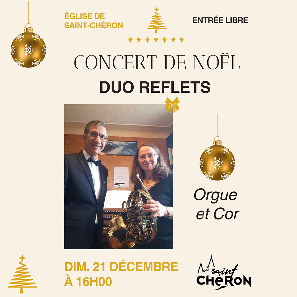 L’Église de Saint-Chéron a le plaisir d’accueillir le Duo Reflets pour un Concert de Noël exceptionnel. Ce duo propose une rencontre musicale rare et envoûtante entre la majesté de l’orgue et la richesse chaleureuse du cor d’harmonie.