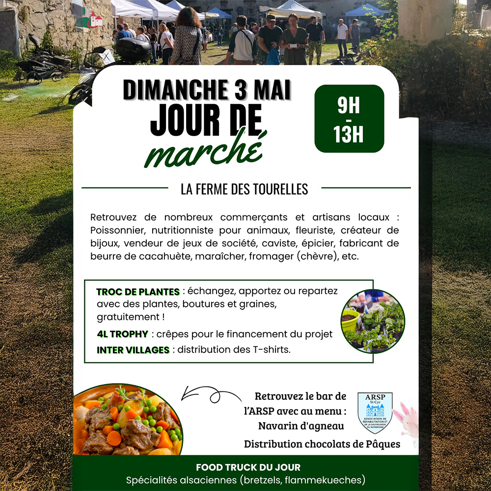 En plus du marché, plusieurs animations rythmeront la matinée : un espace de troc de plantes et de graines, la distribution des T-shirts Inter Villages ainsi qu’une vente de crêpes solidaire. Vous pourrez vous restaurer sur place grâce au traditionnel navarin d’agneau de l’ARSP et aux spécialités alsaciennes du Food Truck du jour.