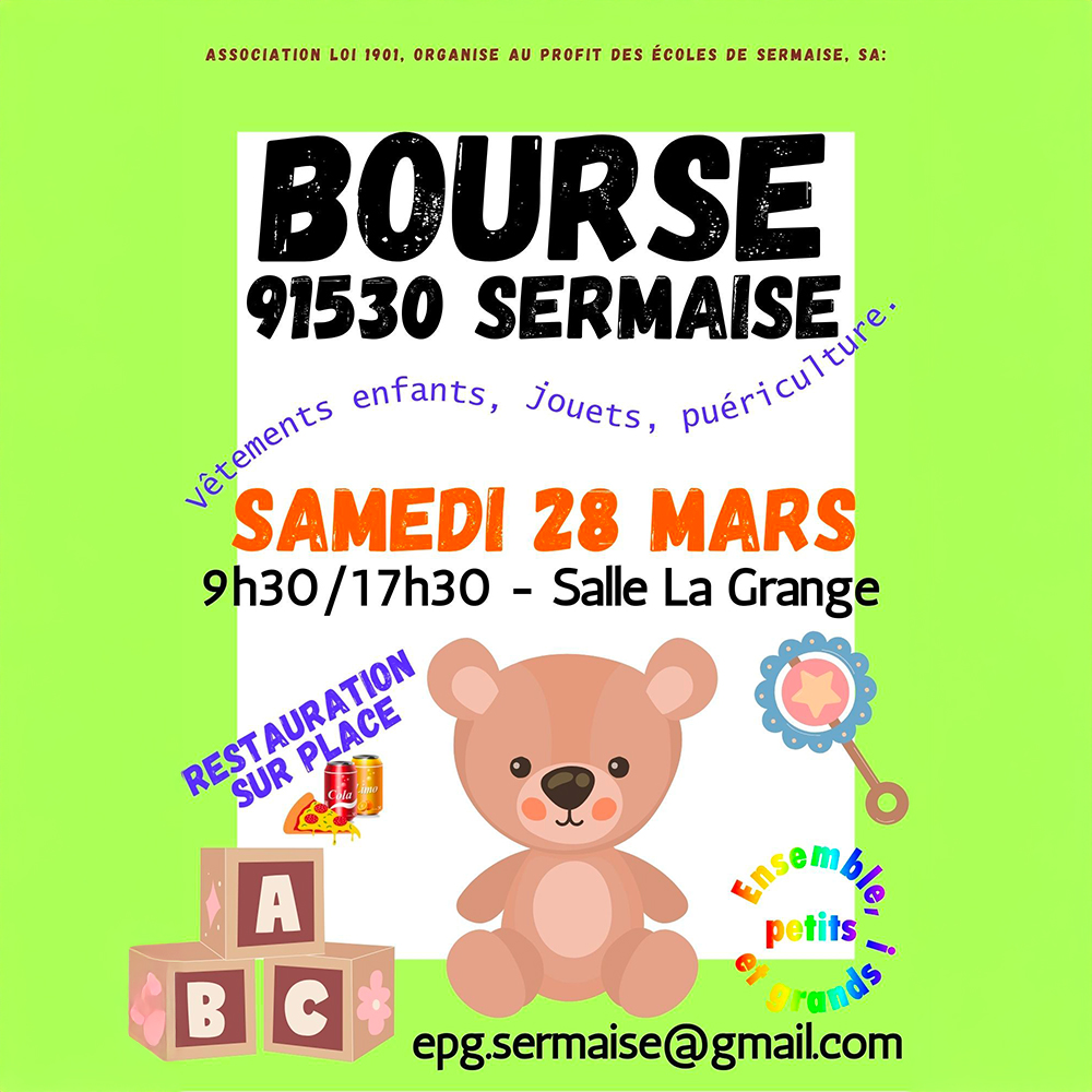 L’association loi 1901 de Sermaise vous invite à sa bourse aux vêtements, jouets et articles de puériculture. Organisé au profit des écoles de la commune, cet événement est l’occasion idéale de s’équiper à petit prix tout en soutenant les projets pédagogiques de nos enfants.
