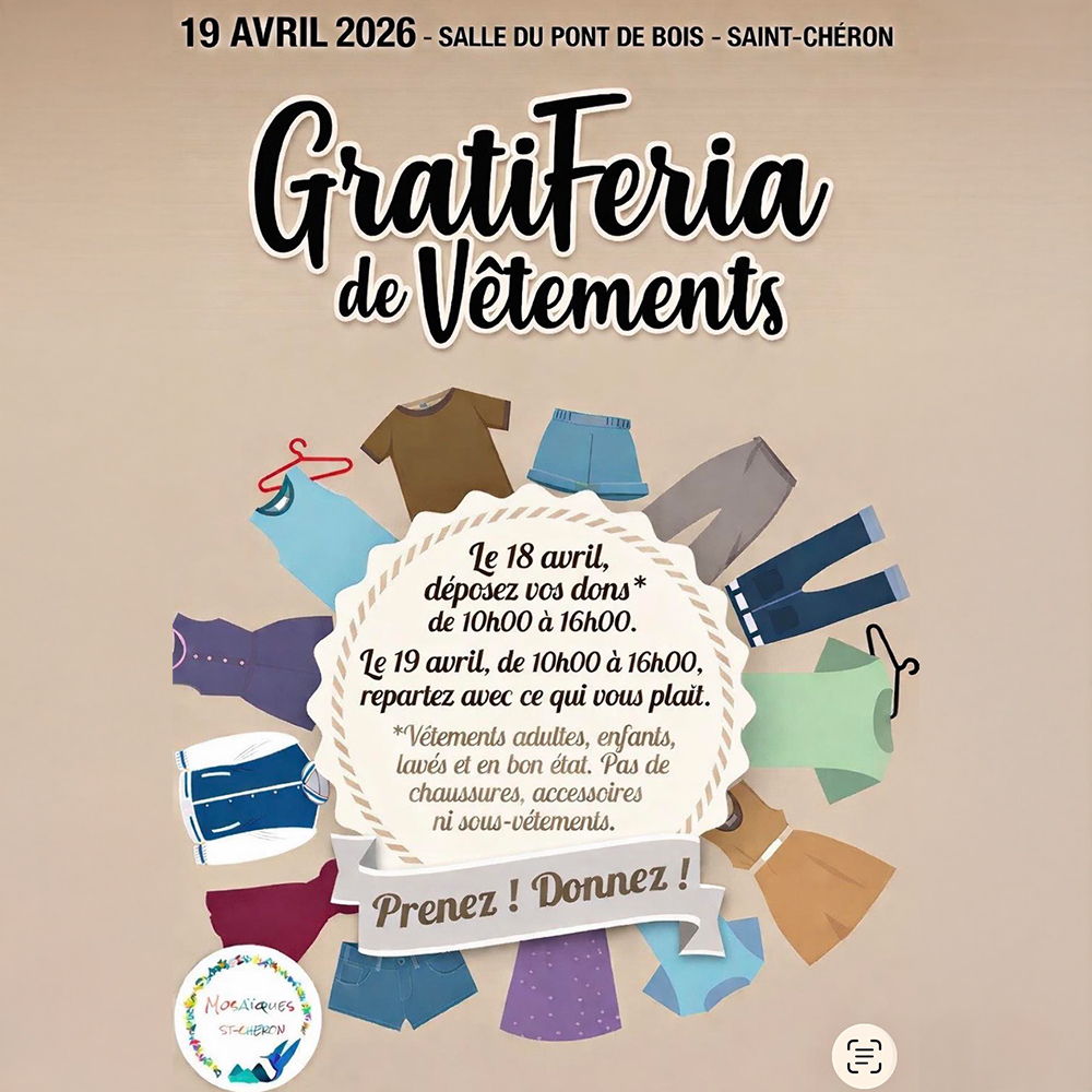 L’association Mosaïques vous invite à participer à sa prochaine Gratiferia dédiée aux vêtements. Cet événement encourage la consommation responsable et l’entraide locale au cœur de Saint-Chéron.