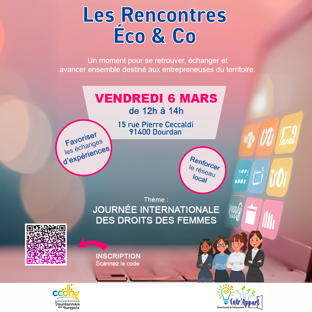 La Communauté de Communes du Dourdannais en Hurepoix vous invite à participer aux « Rencontres Éco & Co ». Cet événement, organisé en l’honneur de la Journée Internationale des Droits des Femmes, est conçu comme une plateforme de partage pour les entrepreneuses locales.