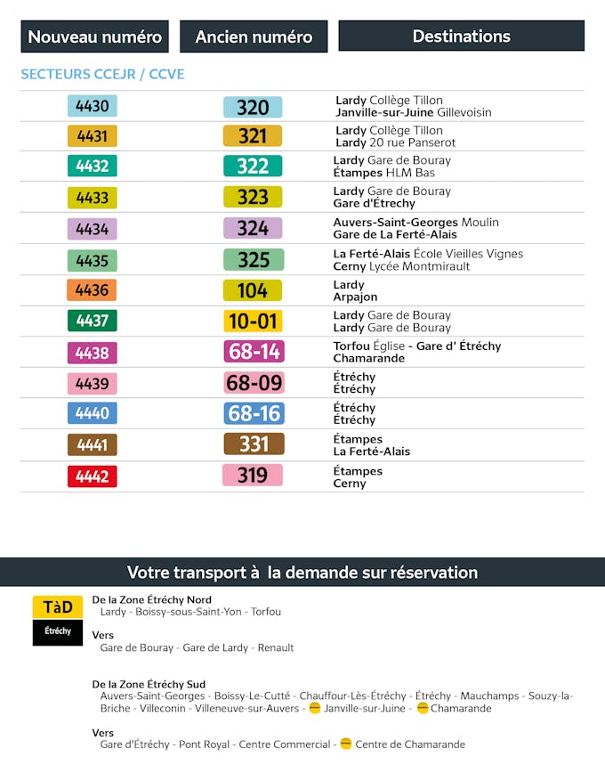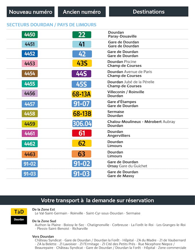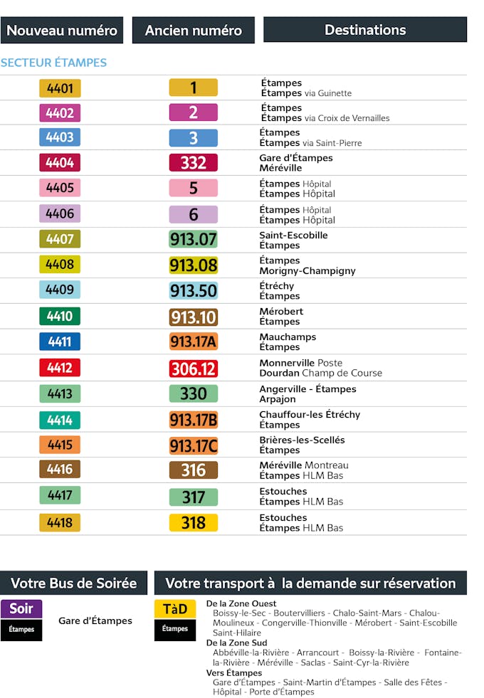 Le principe de renumérotation a été établi par secteur. Vous retrouverez les lignes numérotées de 4401 à 4418 sur le secteur Etampes, les lignes 4430 à 4442 sur les secteurs de la Communauté de Communes Entre Juine et Renard et de la Communauté de Communes du Val d’Essonne, et enfin les lignes portant les numéros de 4450 à 4463 sur les secteurs de Dourdan / Pays de Limours.
