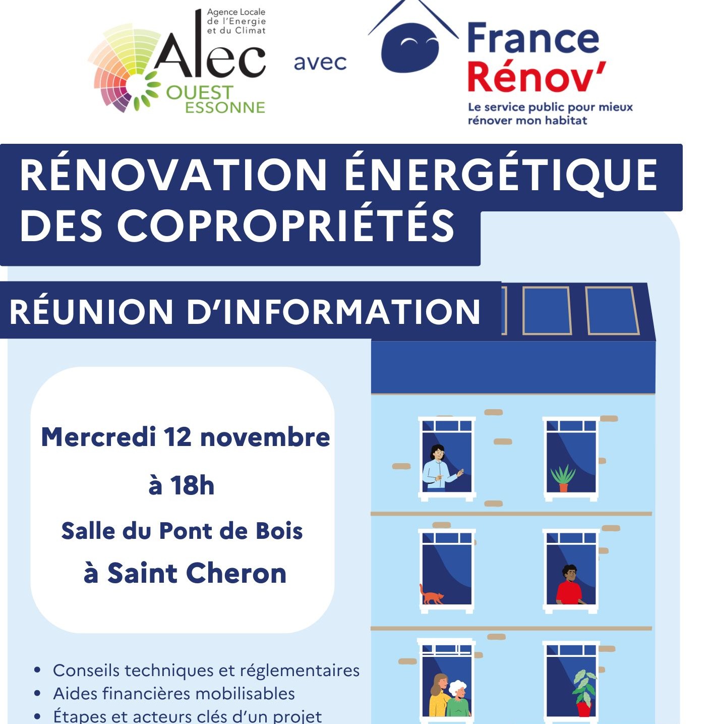 Rendez-vous mardi 12 novembre à 18h, à la Salle du Pont de Bois à Saint-Chéron, pour une réunion d’information dédiée à la rénovation énergétique des copropriétés.