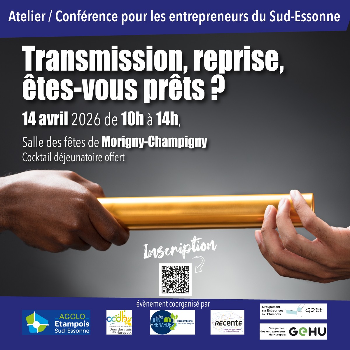 Cet évènement, organisé par la @Communauté d’Agglomération de l’Étampois Sud-Essonne en partenariat avec les deux intercommunalités voisines : la @Communauté de Commune du Dourdannais en Hurepoix et la @Communauté de Communes Entre Juine et Renarde, ainsi que les 3 réseaux d’entreprises (@GEHU, @G2ET et @RECENTE de ce « grand Sud Essonne”, vous donnera les clés pour anticiper, comprendre et réussir votre transmission ou votre reprise d’activité.